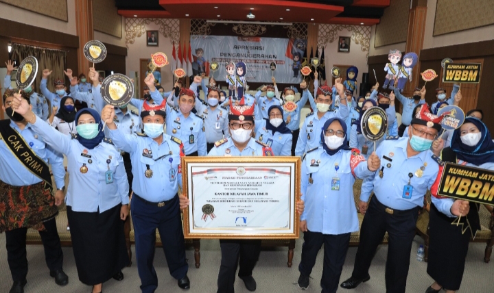“Alhamdulillah, selain sebagai pembina, Kanwil Kemenkumham Jatim juga sukses sebagai pelaksana dan meraih predikat WBBM,” ujar Kepala Kanwil Kemenkumham Jatim Krismono usai mengikuti acara Apresiasi dan Penganugerahan Zona Integritas Menuju WBK/ WBBM 2021 oleh KemenPAN-RB, Senin, 20 Oktober 2021.