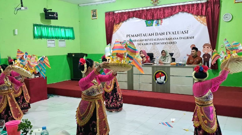 Tari Ladu Pasar Legi karya SMP Negeri 1 Sukodono jadi sungguh pembuka acara Pemantauan dan Evaluasi Pengimbasan Revitalisasi Bahasa Daerah