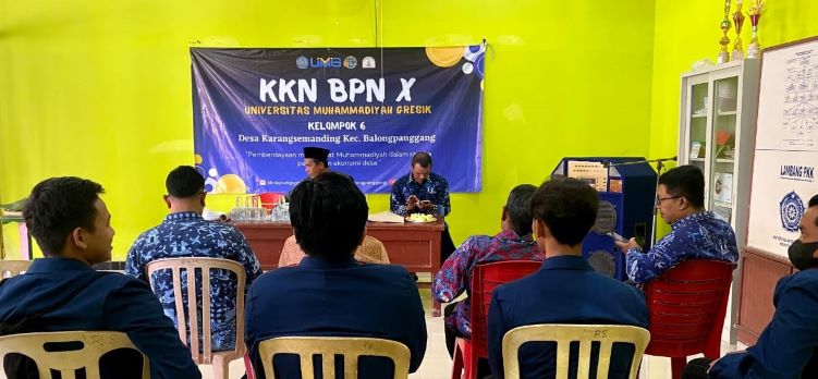 GRESIK (RadarJatim.id) — Mahasiswa Kuliah Kerja Nyata (KKN) Badan Pertanahan Nasional (BPN) Universitas Muhammadiyah Gresik (UMG) mengakhiri masa pengabdian mereka di Desa Karangsemanding, Kec. Balongpanggang, Gresik, Jawa Timur, Senin (19/6/2023). Menandai perpisahan sekaligus pamit balik ke kampus, mereka tumpengan bersama perangkat desa, kepala SD dan guru di aula kantor desa.