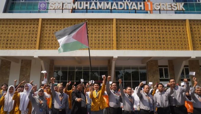 GRESIK (RadarJatim.id) — Aksi Bela Palestina di SMA Muhammadiyah 1 (Smamsatu) Gresik, Jawa Timur yang berlangsung serentak dilakukan serentak bersama sekolah dan perguruan tinggi Muhammadiyah se-Indonesia, Selasa (7/5/2024), tak hanya mengutuk tragedi kejahatan kemanusiaan yang melanda warga Palestina, tapi juga menyerukan boikot terhadap produk-produk yang berafiliasi ke Israel.