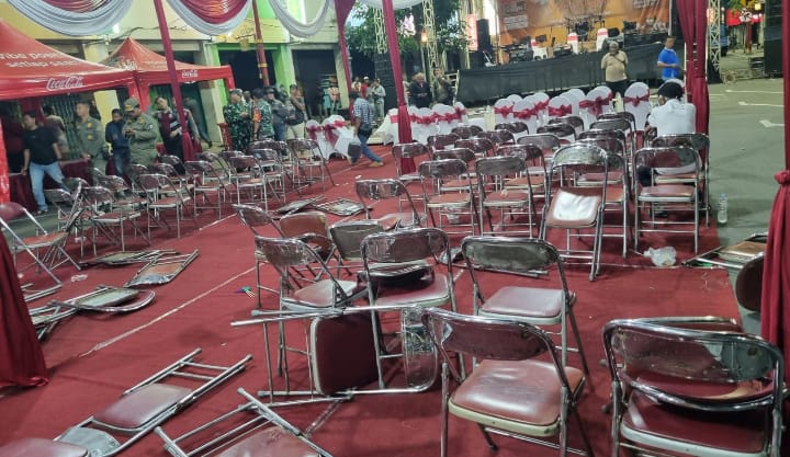 Aparat kepolisian, TNI hingga Satpol PP pun datang. Mereka mencoba untuk meredam kegaduhan yang terjadi. Tapi, tidak ada titik temu. Setelah dialog, tiba-tiba sekelompok orang itu pun berlarian ke arah kursi penonton. Kursi-kursi peserta dibalik-balikkan. Seketika, para penonton dan tamu undangan yang hadir histeris, berlarian.