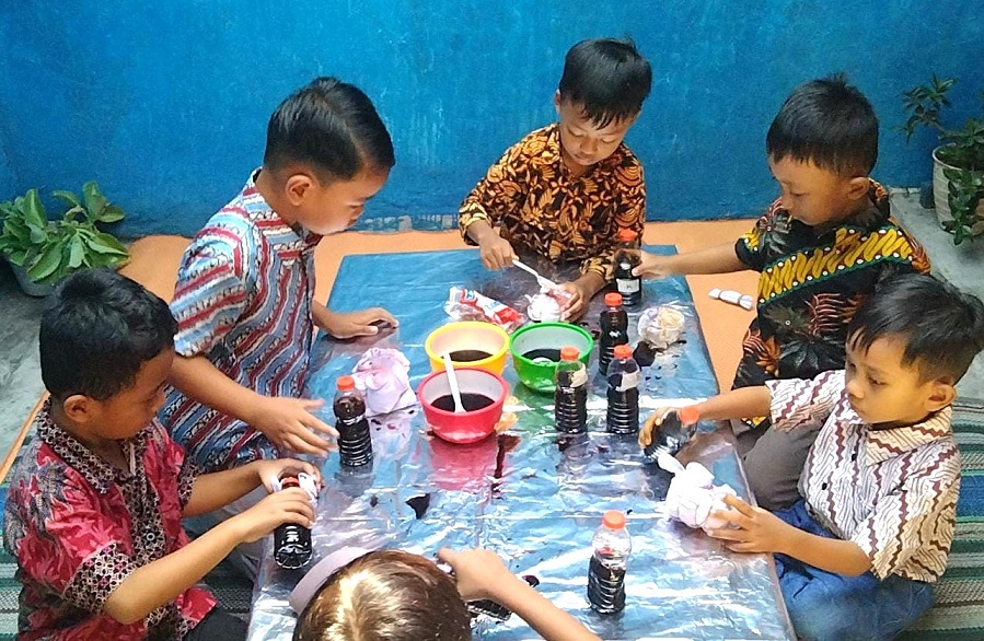 Setelah melakukan kunjungan kedua candi tersebut, anak-anak kami ajak belajar untuk membatik dengan teknik semprotan. “Dalam kunjungan tersebut, seluruh anak-anak beserta wali murid juga mengenakan busana batik. Jadi kita memperingatinya secara total,” katanya.