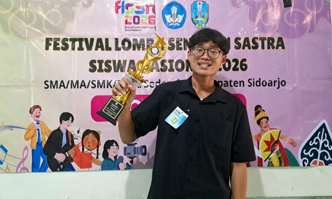Usai meraih penghargaan pada (18/4/2026) di SMA Negeri 3 Sidoarjo, Galang mengatakan tema yang diangkat adalah ‘Jejak Karya di Kampung Sandal’.