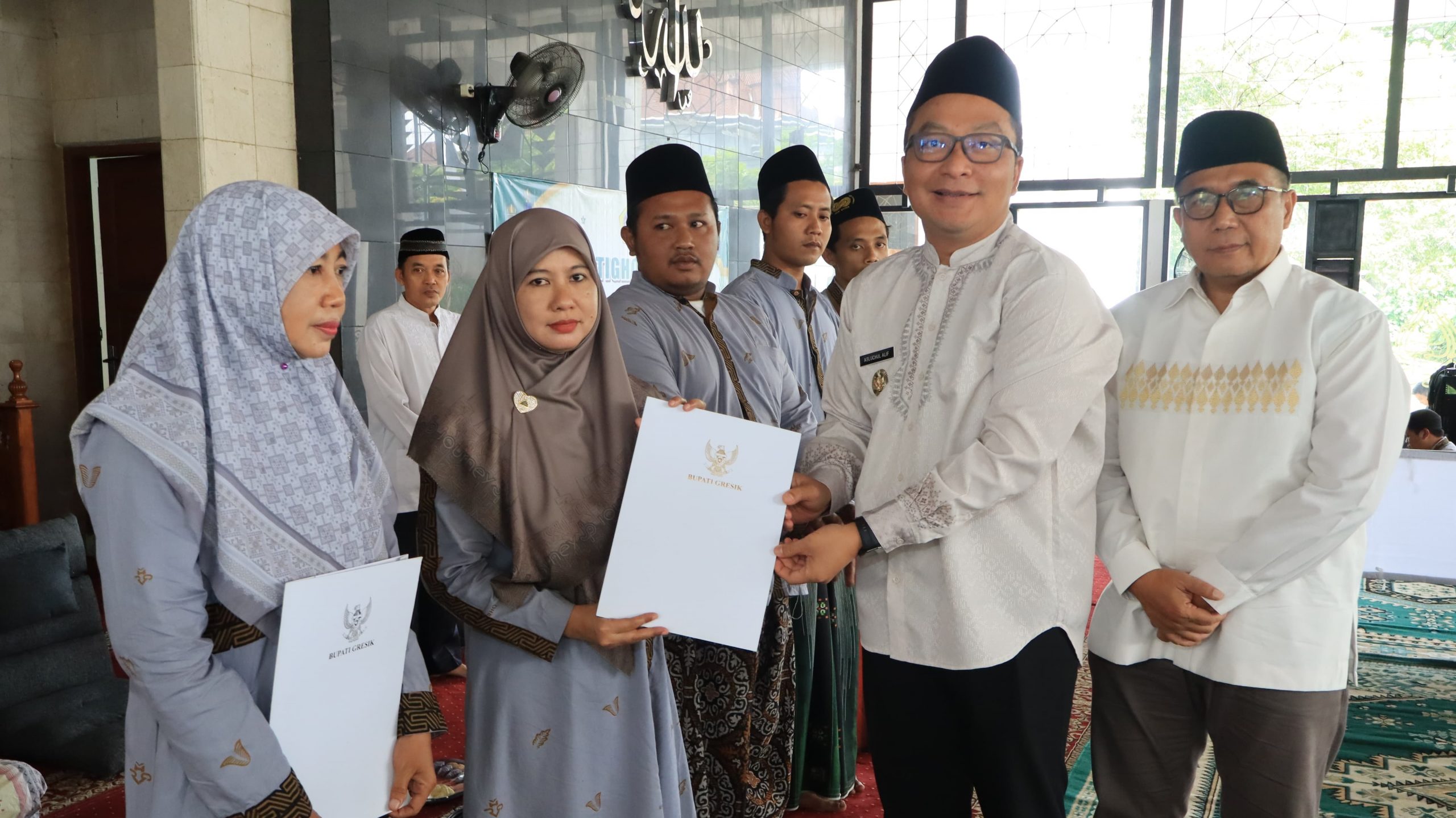 Penyerahan secara simbolis dilakukan oleh Wakil Bupati Gresik, Asluchul Alif, kepada perwakilan huffadz, didampingi Sekretaris Daerah Kabupaten Gresik, Achmad Washil Miftahul Rachman.