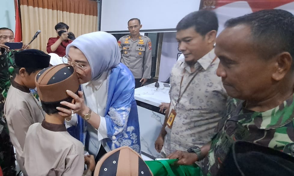 Arzeti memberi santunan dan menciumi kasih sayang pada anak-anak yatim