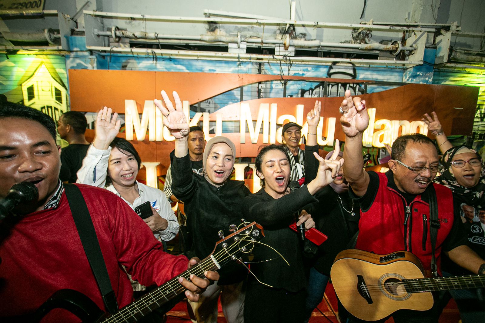 Menyanyi bersama sejumlah musisi Jalanan dengan membawakan lagi Rek Ayo Rek dan Ganjar Pranowo Pilihan Kami diikuti secara antusias oleh pengunjung jalan Tunjungan. (RJ/RED)