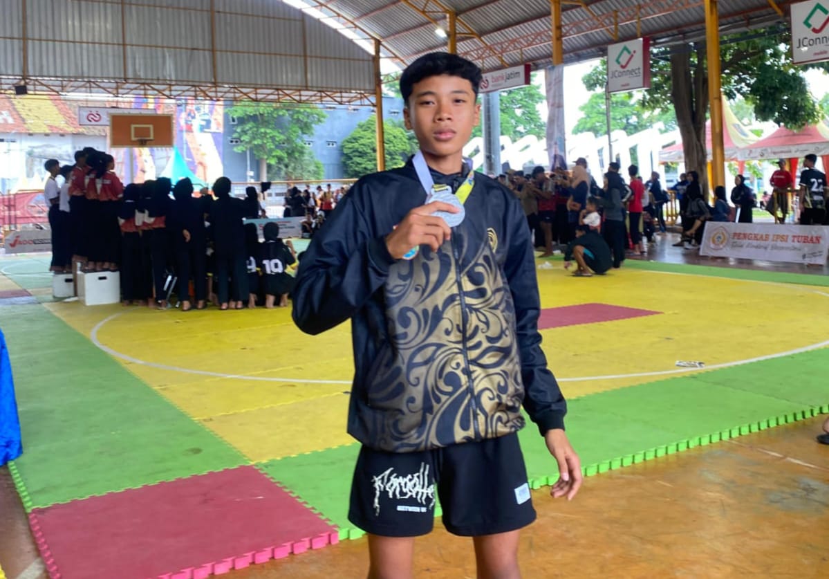 TUBAN (Radarjatim.id) – Semangat juang kembali berkobar di arena Pencak Silat Bupati Tuban Cup 2025. Agung Nugroho, atlet kebanggaan SMPN 1 Soko, Kabupaten Tuban, berhasil meraih juara II dalam ajang bergengsi yang berlangsung di GOR Ranggajaya Anoraga pada 7–9 November 2025.