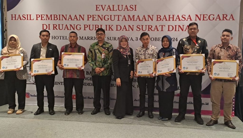 SURABAYA (RadarJatim.id) — Balai Bahasa Jawa Timur telah menyelenggarakan ‘Evaluasi Hasil Pembinaan Pengutamaan Bahasa Negara di Ruang Publik dan Surat Dinas’ yang diikuti oleh 45 lembaga terbina, 15 dinas pendidikan, dan 10 dinas pariwisata, pada (3/10/2024) pagi di Ruang Pertemuan Hotel JW Marriott Jalan Embong Malang, Surabaya.