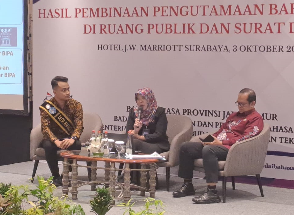 SURABAYA (RadarJatim.id) — Balai Bahasa Jawa Timur telah menyelenggarakan ‘Evaluasi Hasil Pembinaan Pengutamaan Bahasa Negara di Ruang Publik dan Surat Dinas’ yang diikuti oleh 45 lembaga terbina, 15 dinas pendidikan, dan 10 dinas pariwisata, pada (3/10/2024) pagi di Ruang Pertemuan Hotel JW Marriott Jalan Embong Malang, Surabaya.