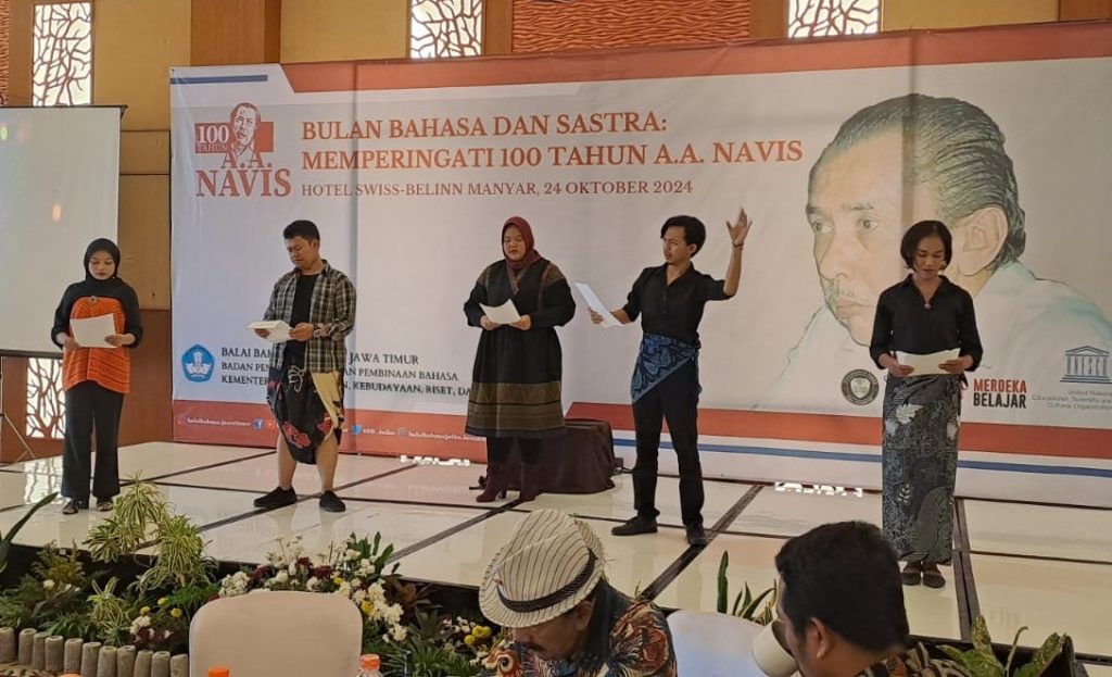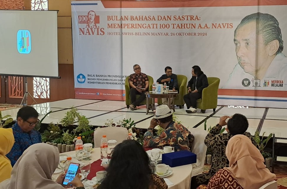 Dalam peringatan tersebut, Balai Bahasa Provinsi Jawa Timur (BBJT) telah menggelar diskusi, atau membedah karya-karya sastra fenomenal A.A Navis ‘Robohnya Surau Kami’ yang ditampilkan dihadapan para generasi milenial, mulai para siswa SMA, SMK juga para mahasiswa dan dosen, juga para komunitas penggiat Literasi, pada Kamis (24/10/2024) pagi di Hotel Swiss Bellinn Manyar Kertoarjo Surabaya.