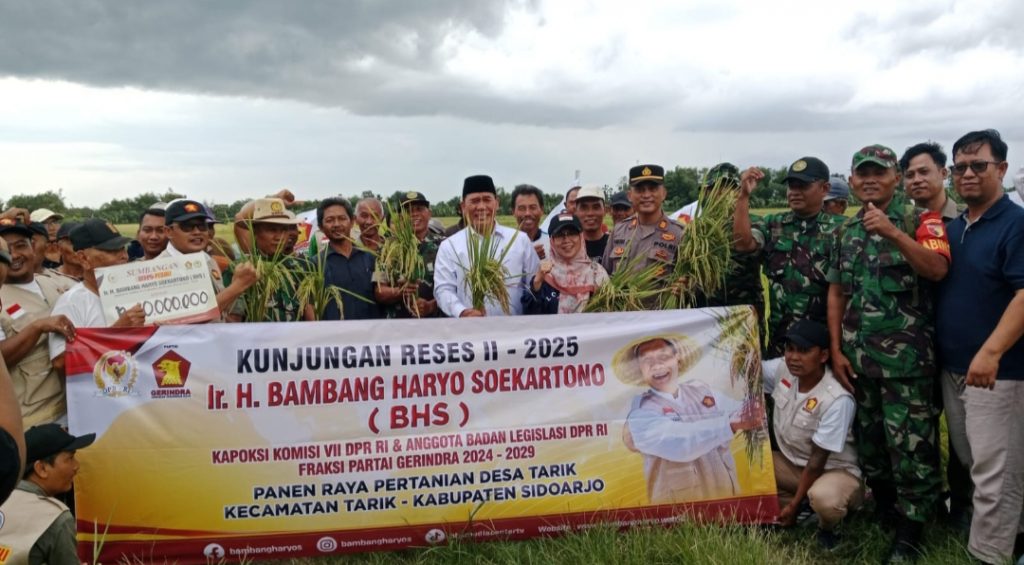 SIDOARJO (RadarJatim.id) Ir.H Bambang Haryo Soekartono (BHS), Bapak Petani Sidoarjo yang juga anggota Komisi VII DPR RI dari Partai Gerindra melaksanakan panen raya padi di Desa Tarik, Kecamatan Tarik, Kabupaten Sidoarjo, Sabtu (22/3/2025).