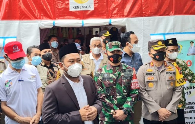 Untuk mengawali gerakan kemanusiaan ini, Bupati Gresik Fandi Akhmad Yani secara simbolis menyerahkan bantuan kepada masyarakat di Posko PPKM Darurat di Kantor Kecamaran Kebomas, dihadiri Dandim 0817 Gresik Letkol Inf Taufik Ismail dan Kapolres Gresik AKBP Arief Fitrianto, serta jajaran Muspika.