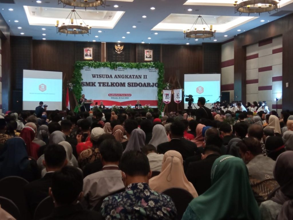 SIDOARJO (RadarJatim.id) Walaupun masih baru, namun lulusannya sudah dipercaya masyarakat. Bisa diterima di dunia kerja dan sekolah lanjutan. Itulah yang dialami SMK Telkom Sidoarjo, terungkap dalam gelar wisuda angkatan II tahun ajaran 2021/2022 di Auditorium Fave Hotel Sidoarjo, Sabtu (25/06/2022).