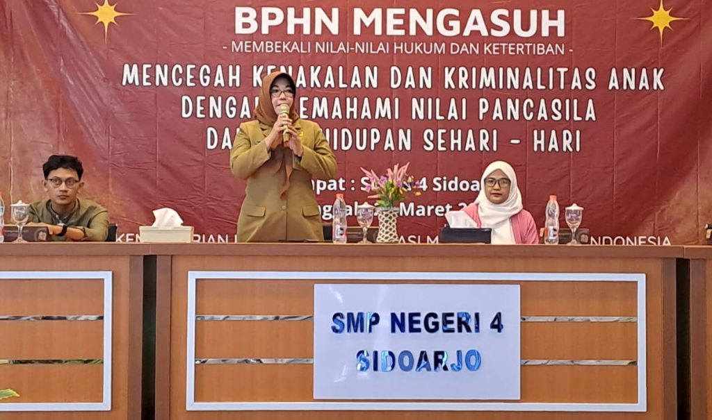 SIDOARJO (Radarjatim.id) — Upaya mencegah kenakalan anak/siswa agar tidak mengarah kepada perbuatan kriminalitas yang berdampak terhadap hukum. SMP Negeri 4 Sidoarjo menghadirkan Kemenkumham (Kementerian Hukum dan Hak Asasi Manusia) RI untuk memberikan pembekalan pehaman hukum dan ketertiban kepada para siswanya.