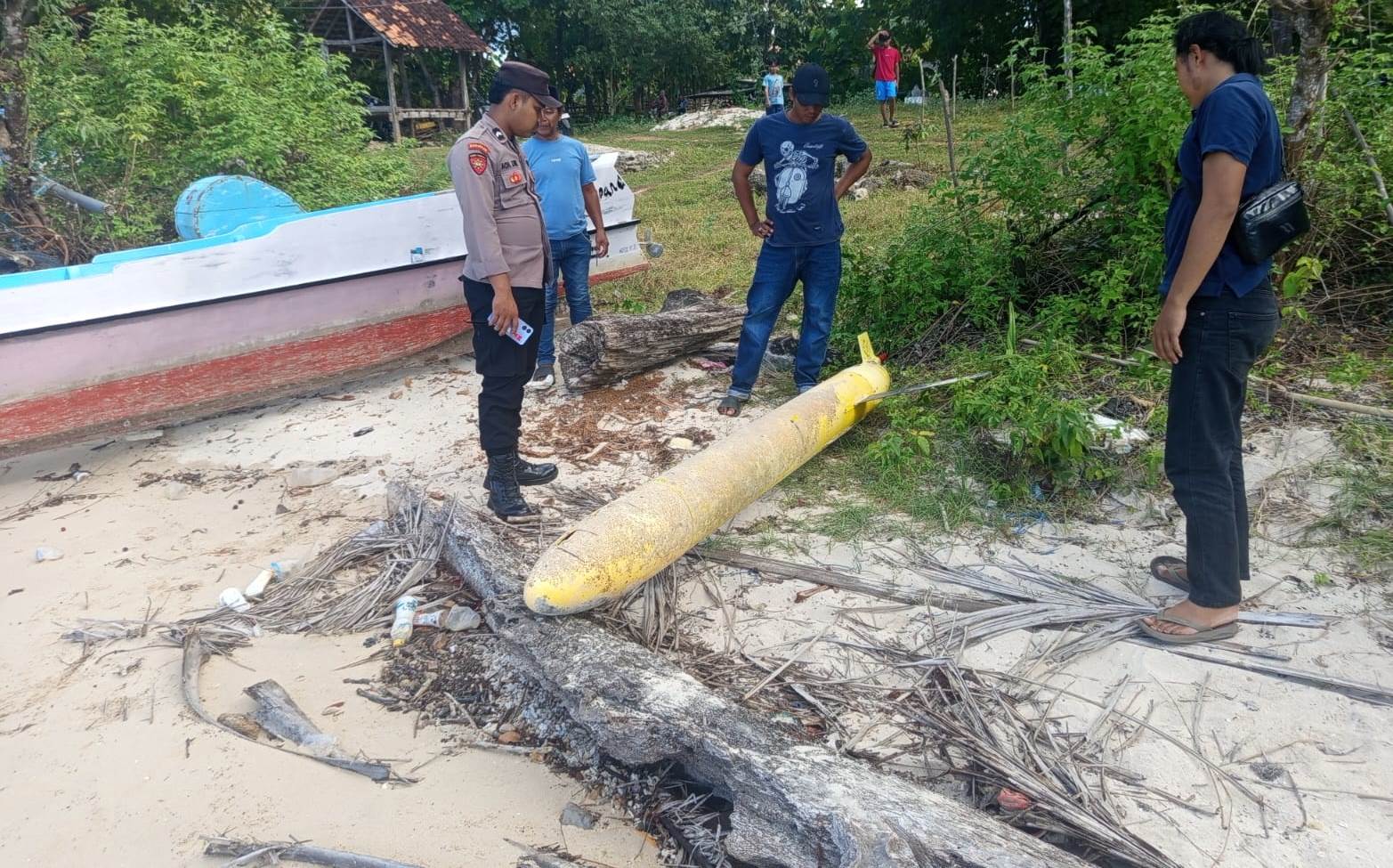 Benda berwarna kuning dengan diameter sekitar 30 sentimeter dan panjang kurang lebih 2 meter tersebut pertama kali ditemukan oleh seorang warga bernama Heri saat hendak mengecek perahunya di pinggir pantai. Saat itu, ia melihat benda mencurigakan mengapung di dekat perahu miliknya.