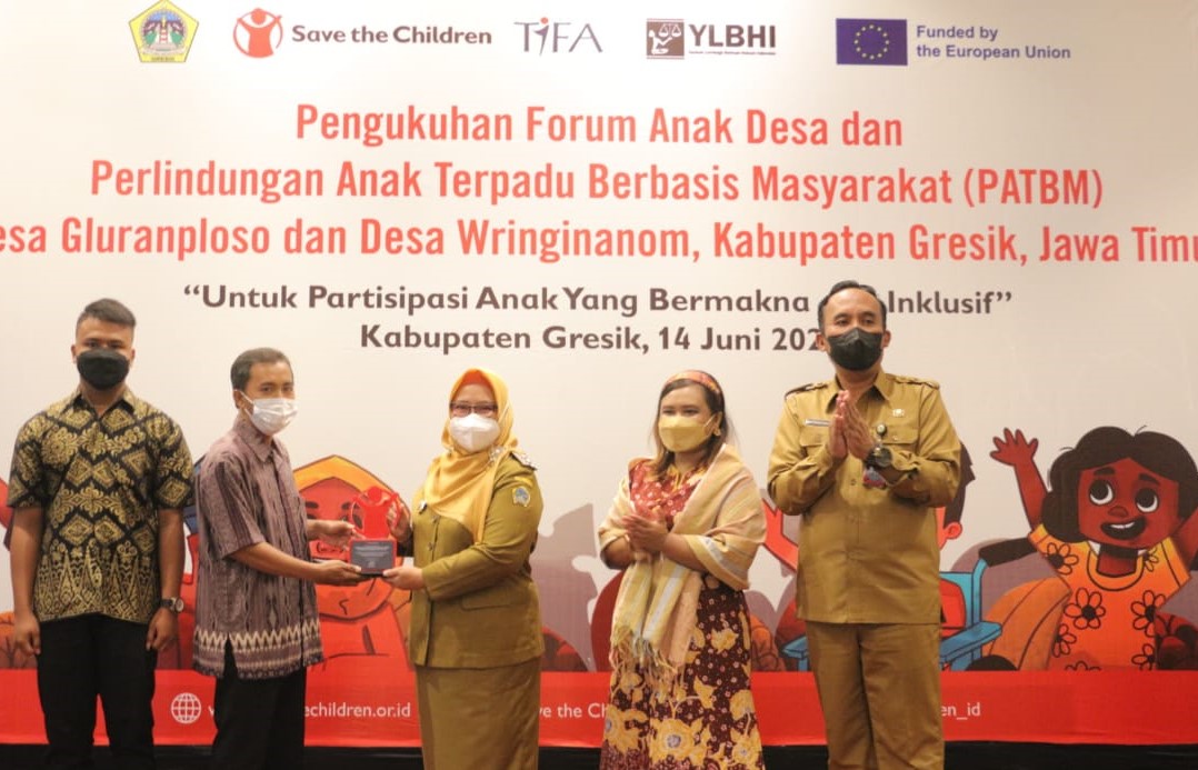 GRESIK (RadarJatim.id) — Organisasi Save the Children bersama Dinas Keluarga Berencana, Pemberdayaan Perempuan dan Perlindungan Anak (KBPPPA) Kabupaten Gresik menggelar pengukuhan Forum Anak Desa (FAD) dan Perlindungan Anak Terpadu Berbasis Masyarakat (PATBM) pada Desa Gluranploso, Kecamatan Benjeng dan Desa Wringinanom, Kecamatan Wringinanom.