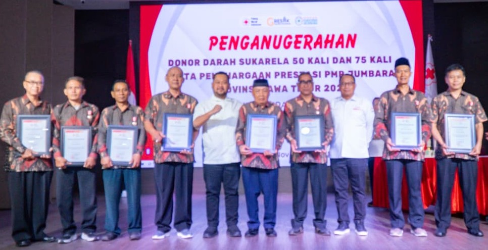 GRESIK (RadarJatim.id) — Bupati Gresik Fandi Akhmad Yani membuka acara penganugerahan bagi pendonor darah sukarela sebanyak 50 kali dan 75 kali di Gedung Nasional Indonesia Gresik, Kamis (20/11/2025). Pada kesempatan tersebut, Bupati Yani juga menyerahkan penghargaan prestasi Pasukan Palang Merah Remaja (PMR) pada Jumpa Bakti Gembira (Jumbara) X Provinsi Jawa Timur 2025.