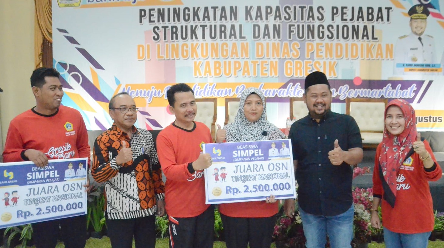 Pada sesi penutupan, Bank Gresik memberikan beasiswa Simpanan Pelajar (Simpel) untuk para siswa berprestasi di lingkup Dispendik senilai Rp 2.500.000. Beasiswa diserahkan secara simbolis oleh Bupati Yani. (sto)