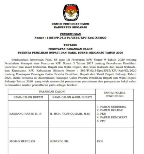 SIDOARJO (radarjatim.id) – Komisi Pemilihan Umum (KPU) Kabupaten Sidoarjo menetapkan pasangan Ir Bambang Haryo Soekartono – H M. Taufiqulbar serta pasangan Muhdlor-Subandi sebagai peserta pemilihan bupati dan wakil bupati Kabupaten Sidoarjo tahun 2020, Rabu (23/9/2020).
