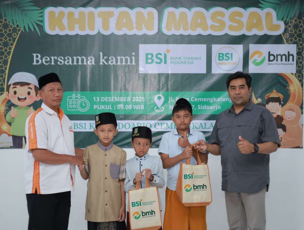 SIDOARJO (RadarJatim.id) Bank Syariah Indonesia Cabang Cemengkalang, bersama BSI Maslahat dan Laznas BMH Unit Sidoarjo menggelar menggelar Khitan Berkah 2025. Kegiatan sosial ini digelar pada Sabtu, 13 Desember 2025 dan diikuti 20 anak dari keluarga yang kurang mampu.