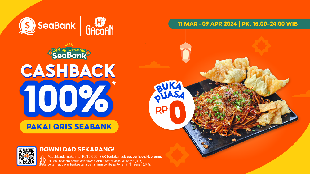 Untuk menemani puasa Sobat SeaBank, kamu bisa menikmati promo cashback hingga 100 persen hanya dengan membayar dengan fitur QRIS. Promo cashback 100 persen memakai QRIS SeaBank di Mie Gacoan berlangsung mulai dari tanggal 11 Maret-9 April 2024, setiap pukul 15:00-24:00 WIB untuk pembelian produk apapun di seluruh outlet Mie Gacoan di Pulau Jawa, Madura, Kalimantan dan Sulawesi.