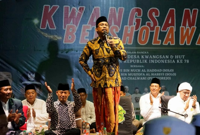 SIDOARJO (RadarJatim.id) – Peringatan Hari Kemerdekaan Republik Indonesia ke 78 di Desa Kwangsan Kec. Sedati sekaligus Haul sesepuh warga setempat, diisi dengan kegiatan bersholawat, yang dihadiri Bupati Sidoarjo H. Ahmad Muhdlor yang juga berharap pada warga untuk sering-sering membaca sholawat, pada (7/8/2023) malam.