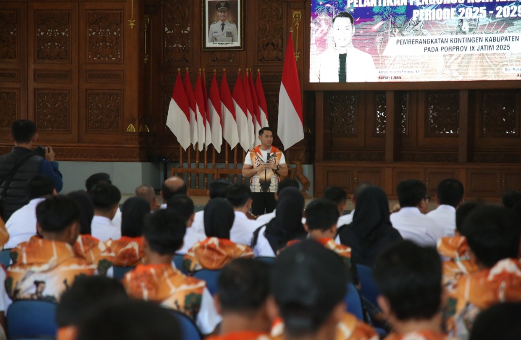 TUBAN (Radarjatim.id) – Bertempat di Pendapa Krida Manunggal, Bupati Tuban Aditya Halindra Faridzky didampingi Wakil Bupati Tuban Joko Sarwono, memberangkatkan kontingen yang akan mengikuti pekan olahraga provinsi (Porprov) Jawa Timur IX tahun 2025.