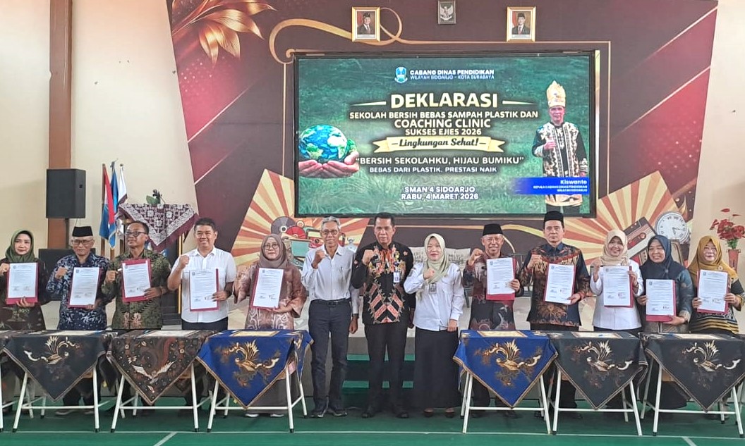 SIDOARJO (Radarjatim.id) — Cabang Dinas Pendidikan (Cabdin) Wilayah Kabupaten Sidoarjo dan Surabaya, secara resmi mendeklarasikan gerakan Sekolah Bebas Sampah Plastik, yang diikuti oleh Kepala Sekolah dan perwakilan guru SMA/SMK/PKLK Negeri maupun Swasta se Sidoarjo dan Surabaya, pada (4/3/2026) di Aula SMA Negeri 4 Sidoarjo.