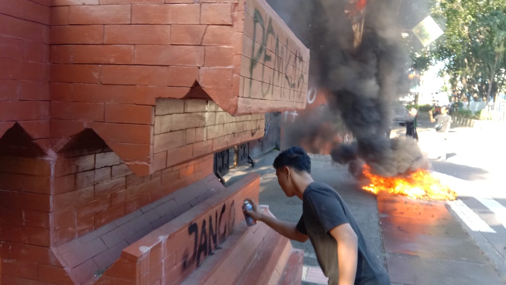 Aksi unjukrasa anggota HMI Cabang Sidoarjo yang bertajuk catatan hitam 100 hari kerja dibawah pemerintahan Bupati dan Wakil Bupati (Wabup) Sidoarjo, H. Subandi dan Hj. Mimik Idayana itu diwarnai dengan aksi bakar ban bekas dan coretan di gapura serta gerbang pendopo Delta Wibawa.