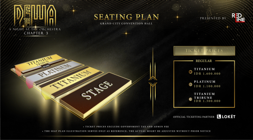Tiket konser DEWA 19 – A Night at The OrchestraChapter3 di Surabaya tersedia dalam 3 kelas yaitu Titanium dengan harga Rp. 1,600,000 | Kelas Platinum dengan harga Rp. 1,100,000 | KelasTitanium Tribune dengan harga Rp. 1,300,000.
