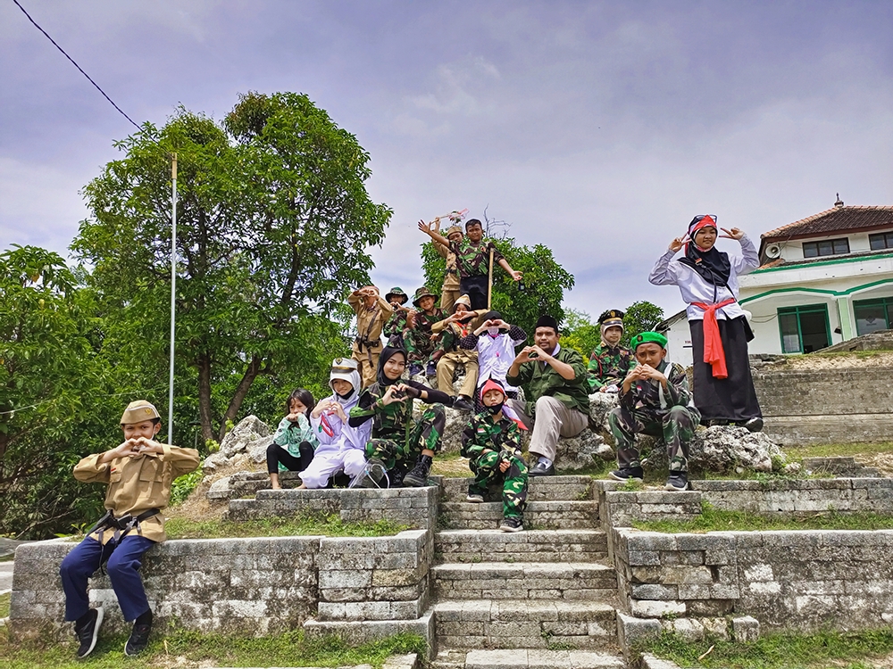Para siswa SD Almadany berpose di situs sejarah Islam berkostum pejuang. (Foto: ist)