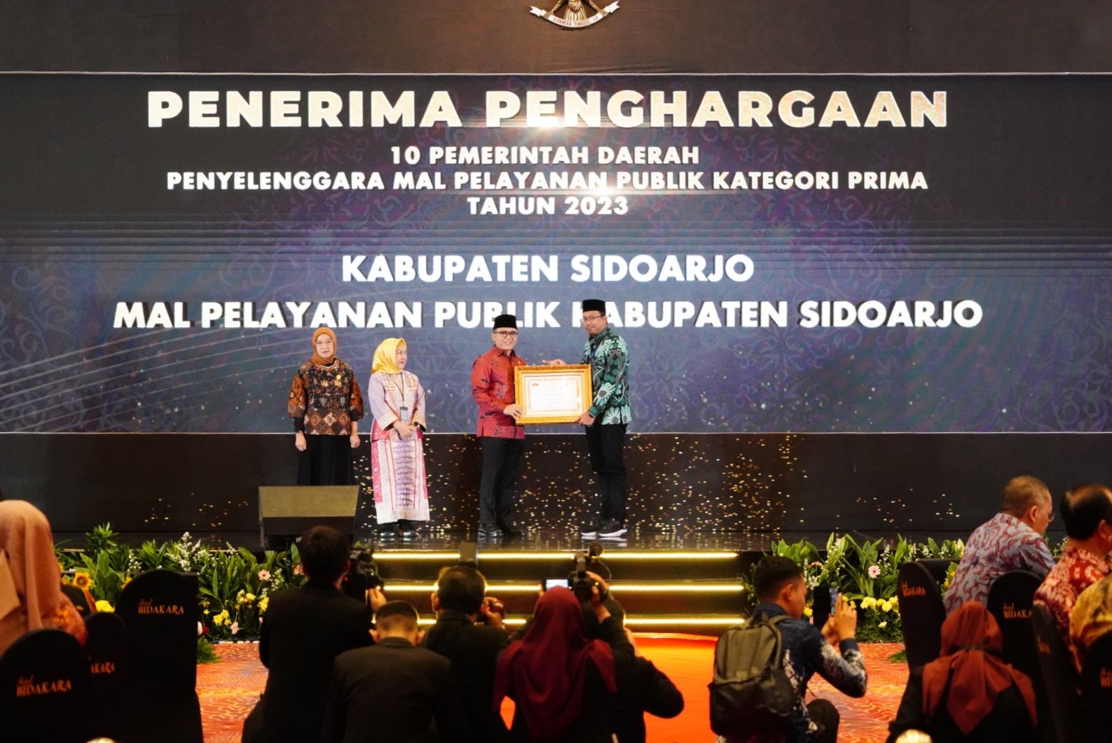 SIDOARJO (RadarJatim.id)– Pemkab Sidoarjo dibawah pimpinan Bupati Sidoarjo Ahmad Mudlor dinobatkan sebagai pemerintah daerah dengan Mal Pelayanan Publik (MPP) terbaik kategori Prima tahun 2023. Penghargaan sekaligus apresiasi diberikan langsung oleh Menteri Pendayagunaan Aparatur Negara dan Reformasi Birokrasi (PAN RB) Abdullah Azwar Anas kepada Bupati Sidoarjo Ahmad Muhdlor di Jakarta, Selasa (21/11/2023).
