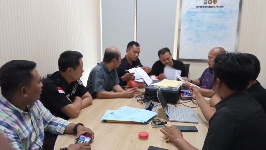 Agung Nugraha bersama dengan Moeh. Arief, Koordinator Divisi (Kordiv) Penanganan Pelanggaran dan Informasi Bawaslu Sidoarjo membawa beberapa tumpuk berkas ke ruang Sentra Pelayanan Kepolisian Terpadu (SPKT) Polresta Sidoarjo.
