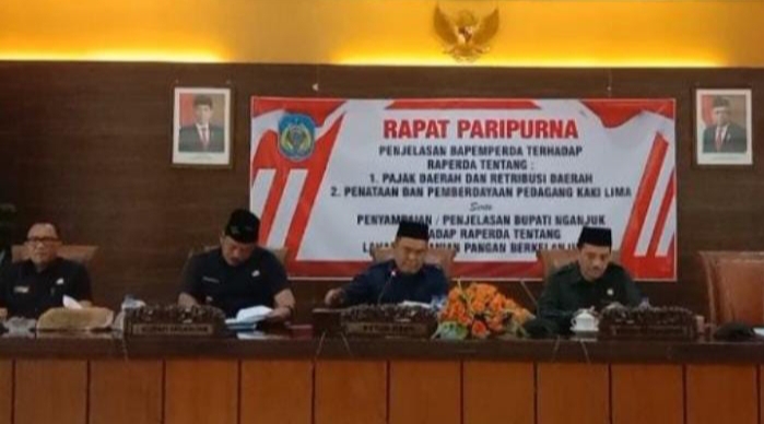 NGANJUK (RadarJatim.id) — DPRD Kabupaten Nganjuk menggelar rapat paripurna terkait penjelasan Raperda tentang Pajak Daerah dan Retribusi Penataan dan Pemberdayaan’ Pedagang Kaki Lima (PKL), Rabu (8/2/2023). penyampaian bupati nganjuk terhadap Raperda berkaitan lahan pertanian memperkuat ketahanan pangan di kabupaten nganjuk.