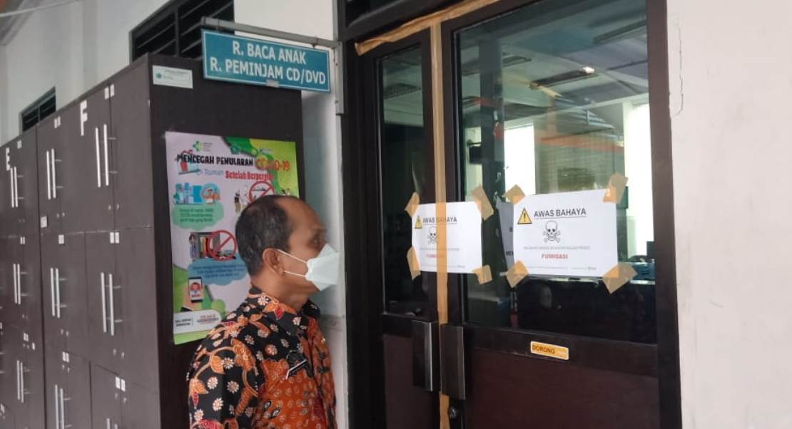 Sementara itu Kepala Bidang Pengolahan Pelayanan dan Pelestarian Bahan Perpustakaan M Basori Alwi S Sos MA menambahkan dengan adanya Fumigasi ini untuk sementara waktu untuk tempat baca ditutup. Sedang untuk bidang-bidang lain masih buka seperti biasa. Proses Fumigasi ini akan berakhir pada Jumat (26/11) nanti, namun tidak langsung buka untuk umum, tetapi masih proses menghilangkan asap Fumigasi. Untuk buka seperti biasa dalam batas PPKM pada Senin (29/11/2021) mendatang,” tambahnya.