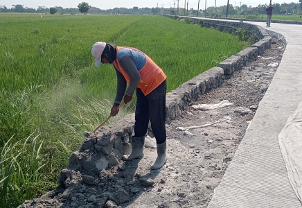 Berdasarkan pantauan dilokasi proyek pembangunan betonisasi Tarik-Mliriprowo pada Senin (28/08/2023) lalu, terlihat seorang pekerja yang membawa godam (palu besar) sedang melakukan pembongkaran sebagian TPT disisi jalan.