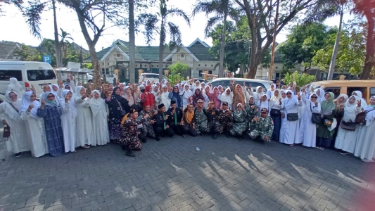 Ibu-ibu Muslimat NU Sidoarjo memberikan dukungan moral kepada Ning Ainun saat diperiksa Bawaslu Sidoarjo di Kantor Sentra Gakkumdu, Perumahan Pondok Mutiara.