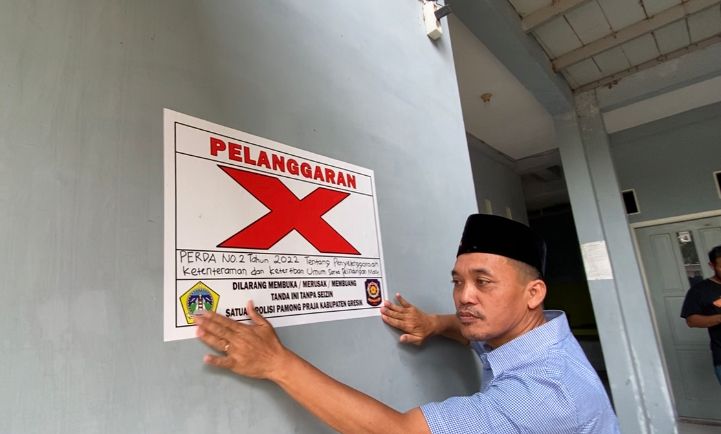 Menandai, bahwa rumah kos itu ditutup sementara, petugas menempelkan segel berupa stiker berukuran besar dengan tanda silang berwarna merah. Segel stiker itu bertuliskan ‘Perda No. 2 tahun 2022 tentang Penyelenggaraan Ketenteraman Ketertiban Umum, serta Perlindungan Masyarakat. Dilarang membuka/merusak tanda ini tanpa seizin Satuan Polisi Pamong Praja Kabupaten Gresik’.