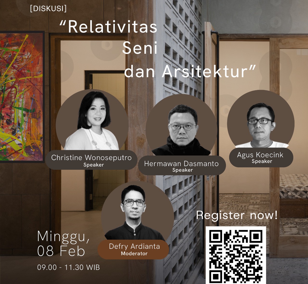 Diskusi dengan tajuk “Relativitas Antara Seni dan Arsitektur” ini akan dibawakan oleh 3 narasumber dari berbagai latar belakang. Ketiganya Adalah: Hermawan Dasmanto (arsitek), Christine Wonoseputro (akademisi) dan Agus Koecink (seniman) pada Minggu (8/2/2026). Diskusi yang berlangsung di Grand Royal Regency K5 03A, Cluster Lavender, Wage, Taman, Sidoarjo, Jawa Timur, ini akan dipandu oleh Defry Ardianta, seorang akademisi sekaligus praktisi arsitektur dari Surabaya, yang menjadi sesi penutup dari rangkaian pameran tunggal Samurai Jalu: Mulai Dari Rumah.