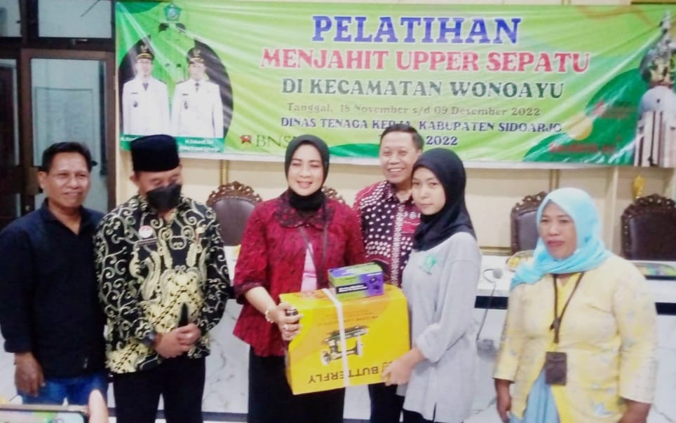 Kali ini di Kecamatan Wonoayu, Disnaker menggandeng Asosiasi Persepatuan Indonesia (Aprisindo) Jarim untuk melatih warganya agar terampil menjahit sepatu kualitas ekspor.
