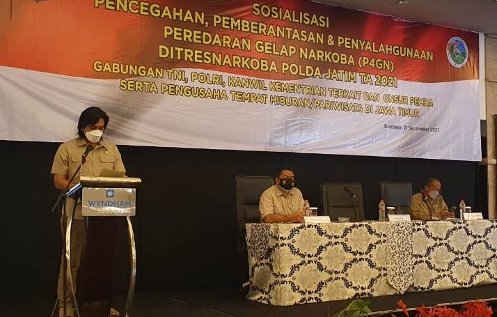 “Kegiatan ini kita laksanakan setiap tahun. Kita ingin membangun sinergitas dengan instansi terkait, mulai dari Kanwilkumham, Bakesbanglinmas, Satpol PP, Imigrasi, Bea Cukai, sampai Jasa Marga kita undang. Termasuk himpunan pariwisata dan tempat hiburan kita undang,” ujar Kabag Binops Ditresnarkoba Polda Jatim, AKBP Samsul Makali disela sosialisasi gabungan program P4GN di Hotel Wyndham, Surabaya, Selasa (21/9/2021).