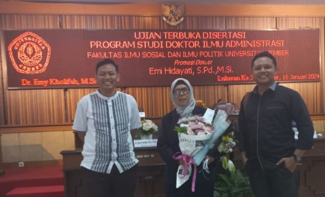 Di hadapan para penguji, Emi berhasil mepresentasikan hasil risetnya. Permasalahan ia jelaskan secara kualitatif dan mendalam. Para penguji pun memberikan apresiasi dengan sangat layak menyandang gelar doktor Administrasi Publik.
