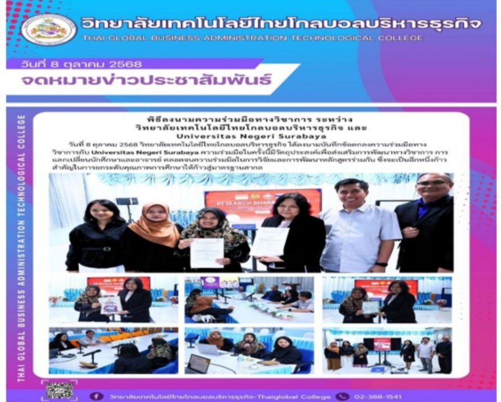BANGKOK (RadarJatim.id) Dosen Program Studi Pendidikan Guru Sekolah Dasar (PGSD) Universitas Negeri Surabaya (UNESA) menjalin kolaborasi akademik dengan Thai Global Business Administration Technological College (TGBC), Thailand, dalam rangka pengembangan inovasi pembelajaran literasi berbasis proyek di kawasan Asia Tenggara, pada 8 Oktober 2025 .