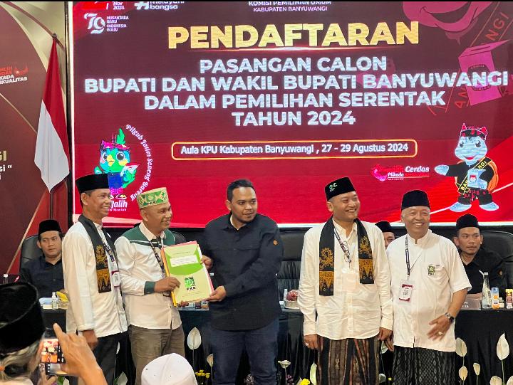 BANYUWANGI (RadarJatim.id)–Pasangan calon (paslon) Moh. Ali Makki Zaini-Ali Ruchi yang diusung oleh Partai Kebangkitan Bangsa (PKB) resmi mendaftar ke kantor KPU Banyuwangi sebagai calon bupati dan wakil bupati Banyuwangi, Rabu 28 Agustus 2024.