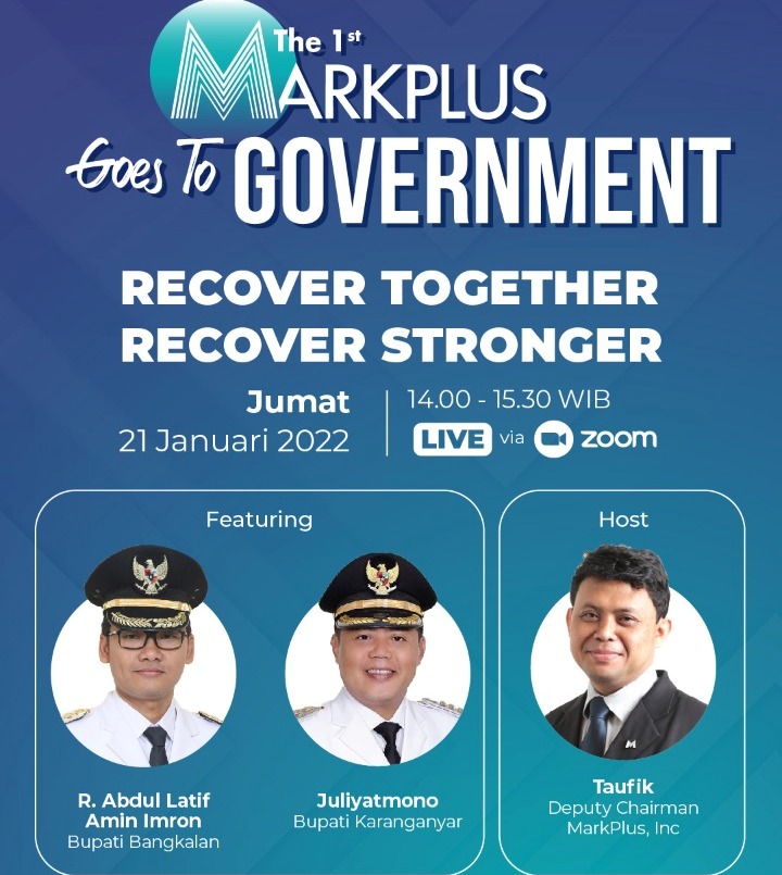 MarkPlus menggelar webinar virtual The 1st MarkPlus Goes to Government bertajuk Recover Together Recover Stronger. Dalam kesempatan ini, hadir Bupati Bangkalan dan Bupati Karanganyar yang menyampaikan beragam upaya memulihkan perekonomian.