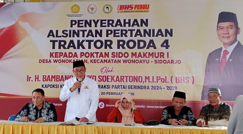 SIDOARJO (RadarJatim.id) Untuk mendukung produktivitas hasil pertanian, Ketua Kelompok Fraksi (Kapoksi) Komisi VII DPR RI Fraksi Partai Gerindra periode 2024-2029, Ir.H.Bambang Haryo Soekartono, M.I.Pol (BHS)menyerahkan bantuan alat dan mesin pertanian (alsintan) kepada petani Desa Wonokasian, Kecamatan Wonoayu Kabupaten Sidoarjo. Bantuan dari Kementerian Pertanian ini diterima Poktan Sido Makmur I berupa traktor roda empat di Balai Desa Wonokasian, Jumat (20/2/2026).