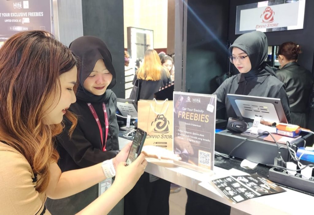 Surabaya X Beauty 2025, Envio Store memberikan hadiah gratis kepada pengunjung, dengan syarat follow Instagram @envio.store dan survey barcode yang tersedia.