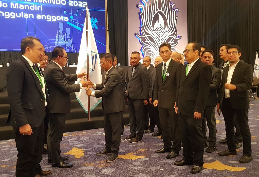 Ir. Erie Heryadi (kanan) menerima bendera pataka sebagai simbol menerima tongkat estafet kepemimpinan DPN Inkindo untuk periode 2022-2026, di Hotel Westin Surabaya, Selasa (6/12) malam.