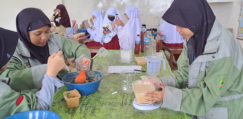 Ia katanya proses awal pembuatannya adalah air 100 mili liter dicampur soda api 64 gram, selanjutnya diaduk sampai larut, terus didiamkan selama 20 menit selanjutnya dituangkan ke minyak jlantahnya dan diaduk hingga seperti mayonnaise. “Terakhir dimasukkan dalam cetakan. Kami lakukan bersama tim dan senang sekali bisa praktek seperti ini,” jelas Jihan.(mad)