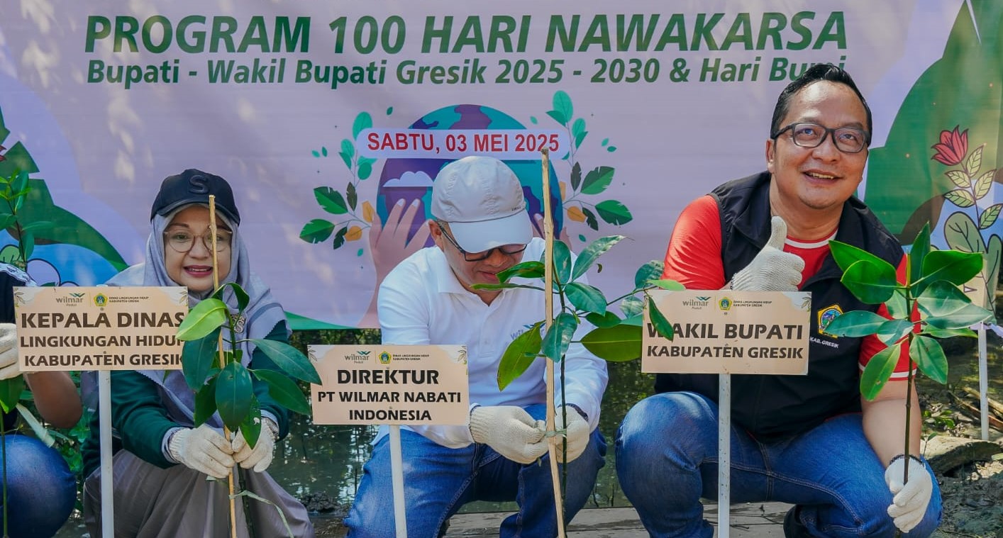 GRESIK (RadarJatim.id) — Pemerintah Kabupaten (Pemkab) Gresik, Jawa Timur, bersama PT Wilmar Nabati Indonesia menanam 1.000 bibit mangrove jenis rhizophora mucronata di kawasan wisata mangrove Karangkiring, Kecamatan Kebomas, Gresik, Sabtu (3/5/2025). Kegiatan ini digelar dalam rangka memperingati Hari Bumi 2025 dan bagian dari pelaksanaan program 100 hari Nawaksara Bupati dan Wakil Bupati Gresik periode 2025–2030.